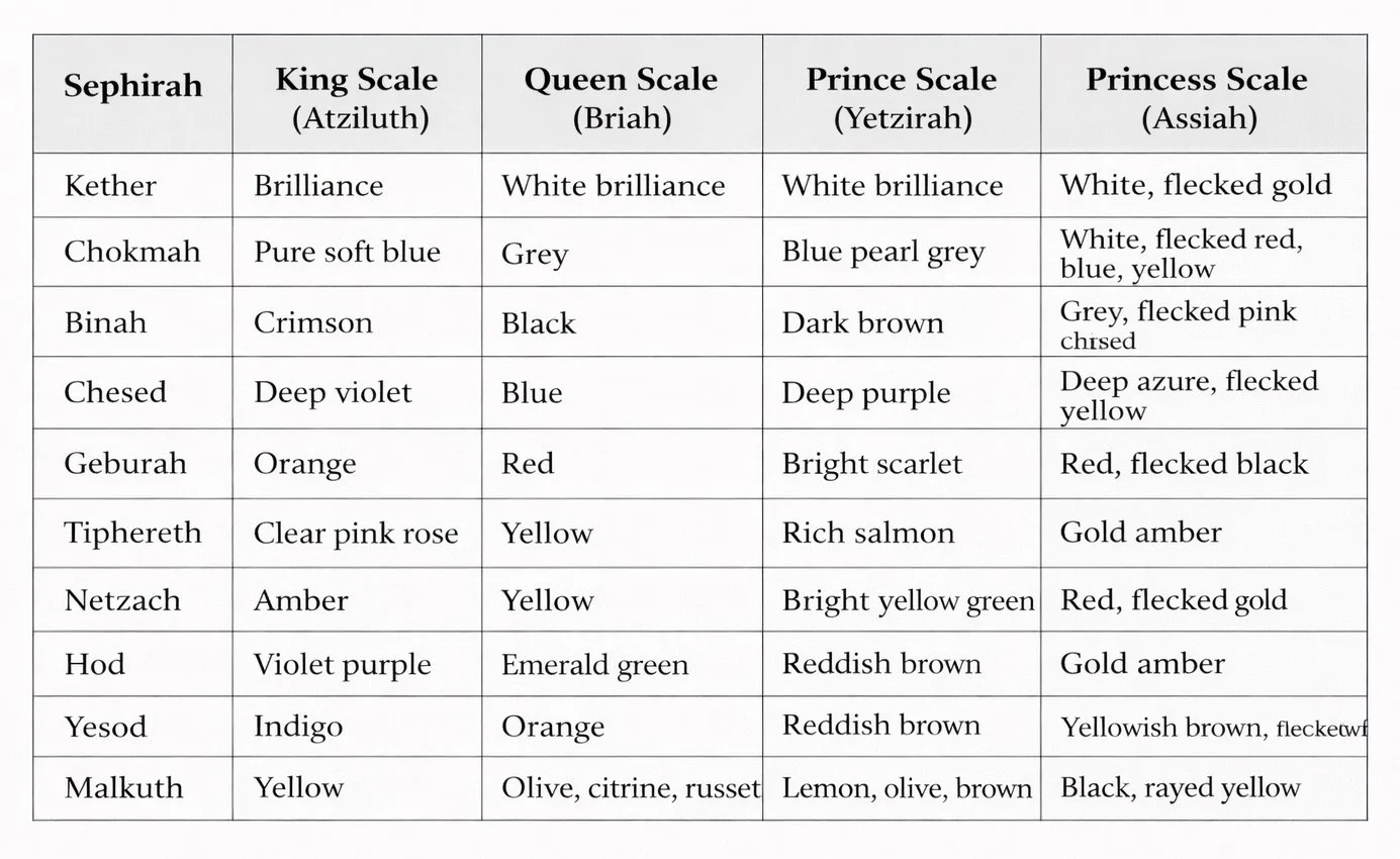 King Scale (Atziluth - Fire): Represents the "natural essence of colour"—the pure, undiluted spiritual archetype before any refraction or reflection. These colours are bold, primary, and direct, emanating from the divine source itself.